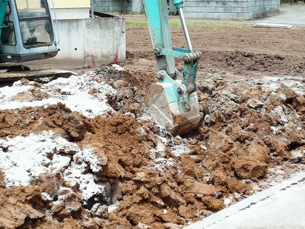 表層の軟弱な部分を堀削した後、セメントなどの固化材を軟弱な地盤に散布し、原地盤と混ぜ合わせて強度を高めながら均等化していきます。